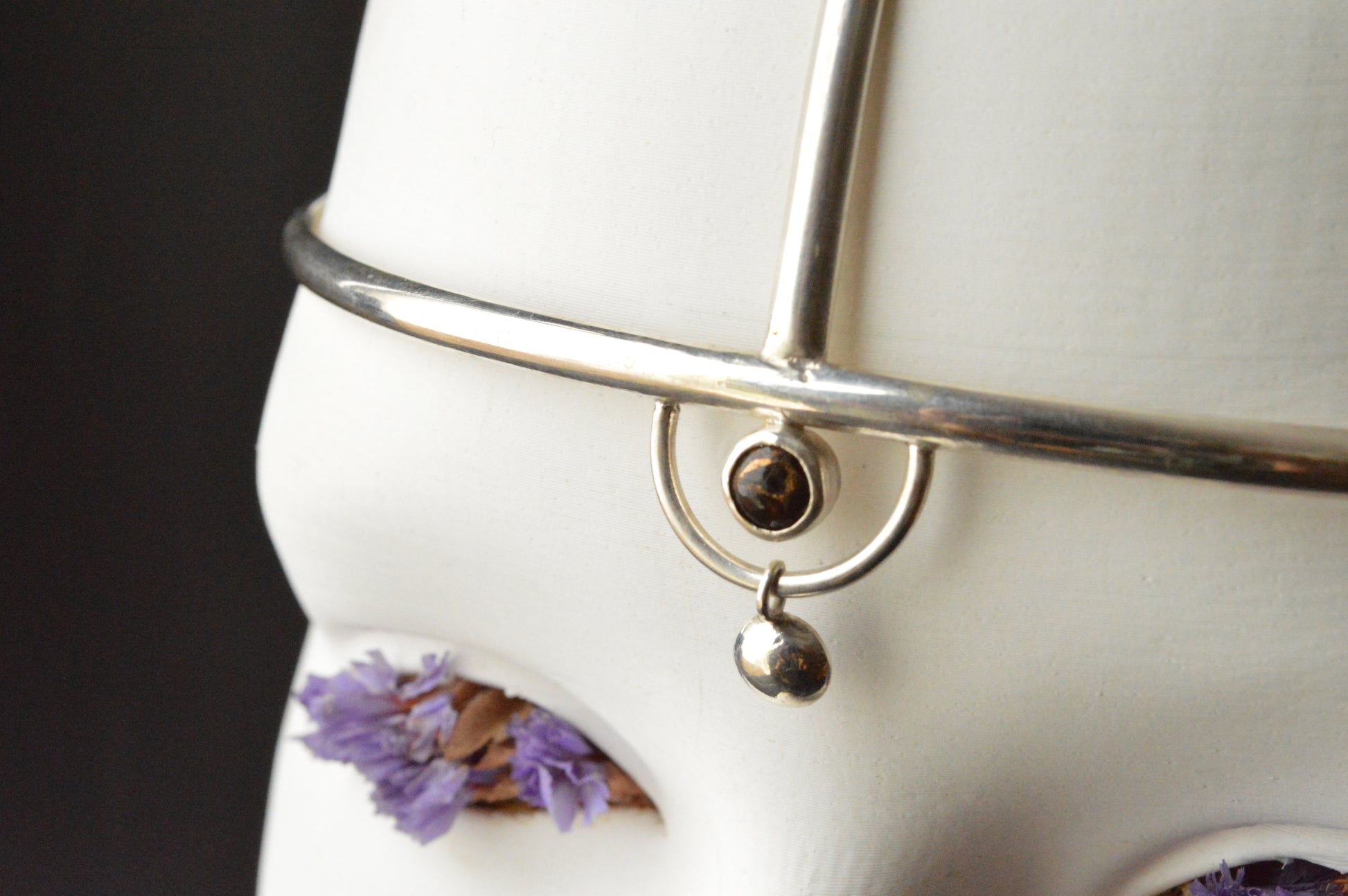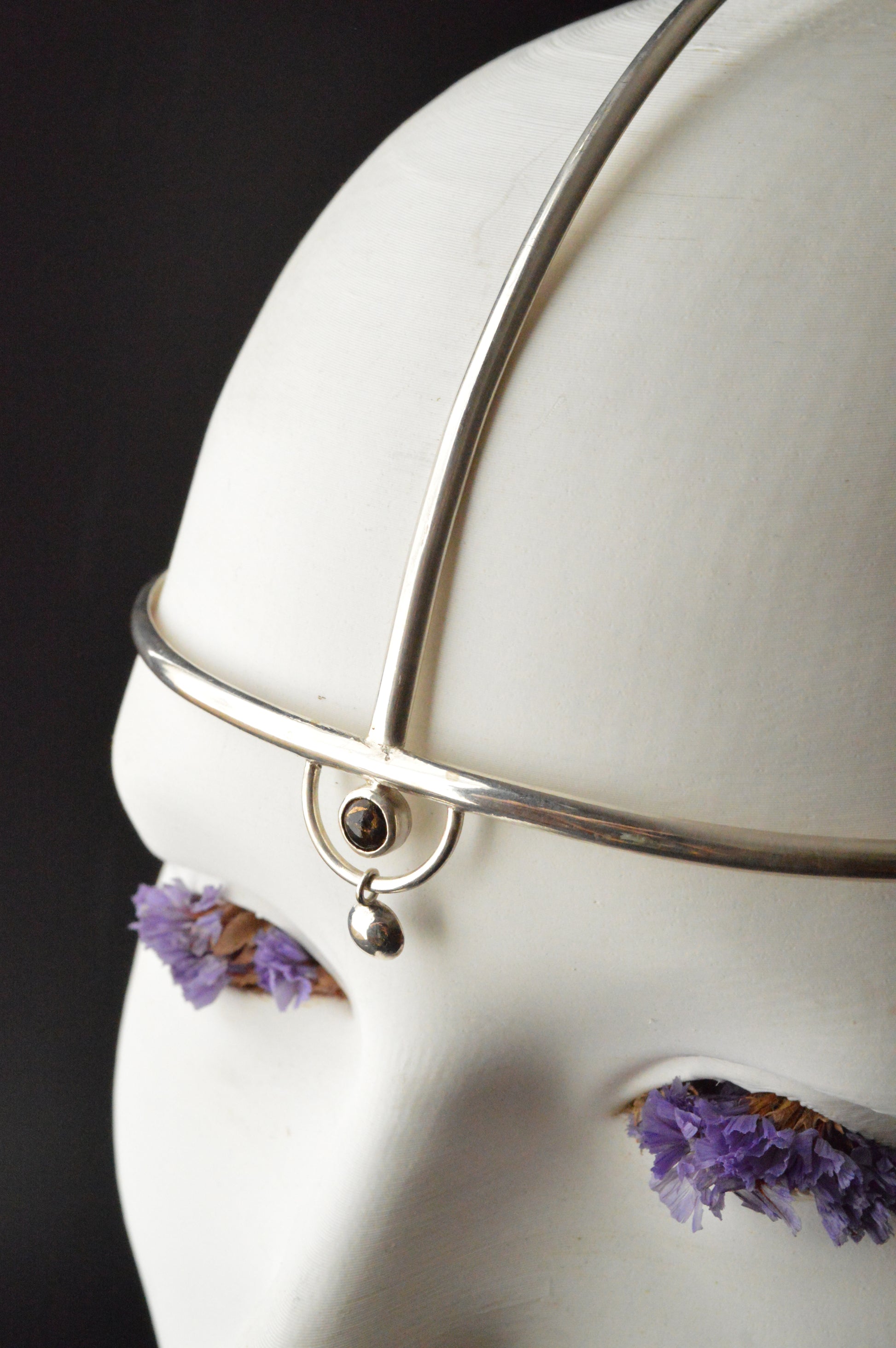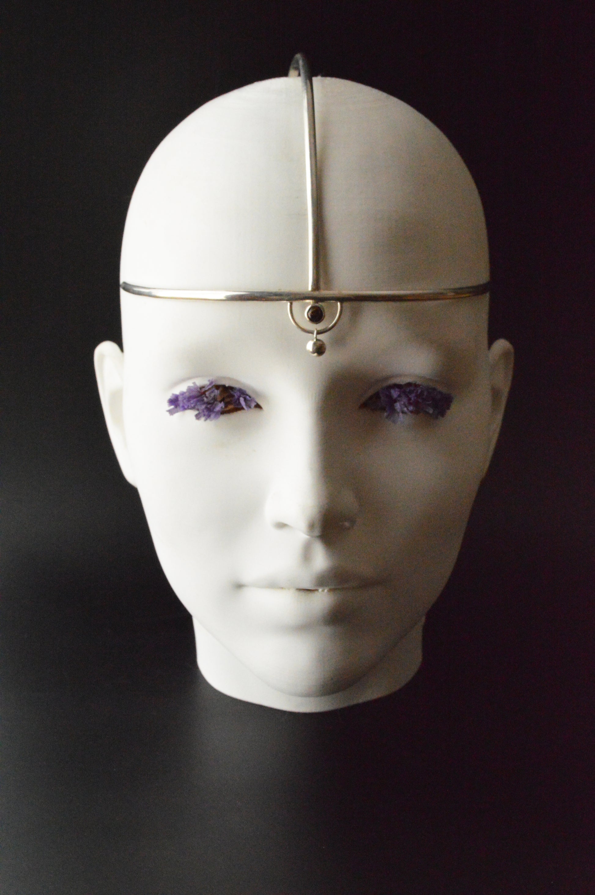 A headpiece that slides onto the top of the head and stays in place thanks to a second part that anchors from one temple to the other.
